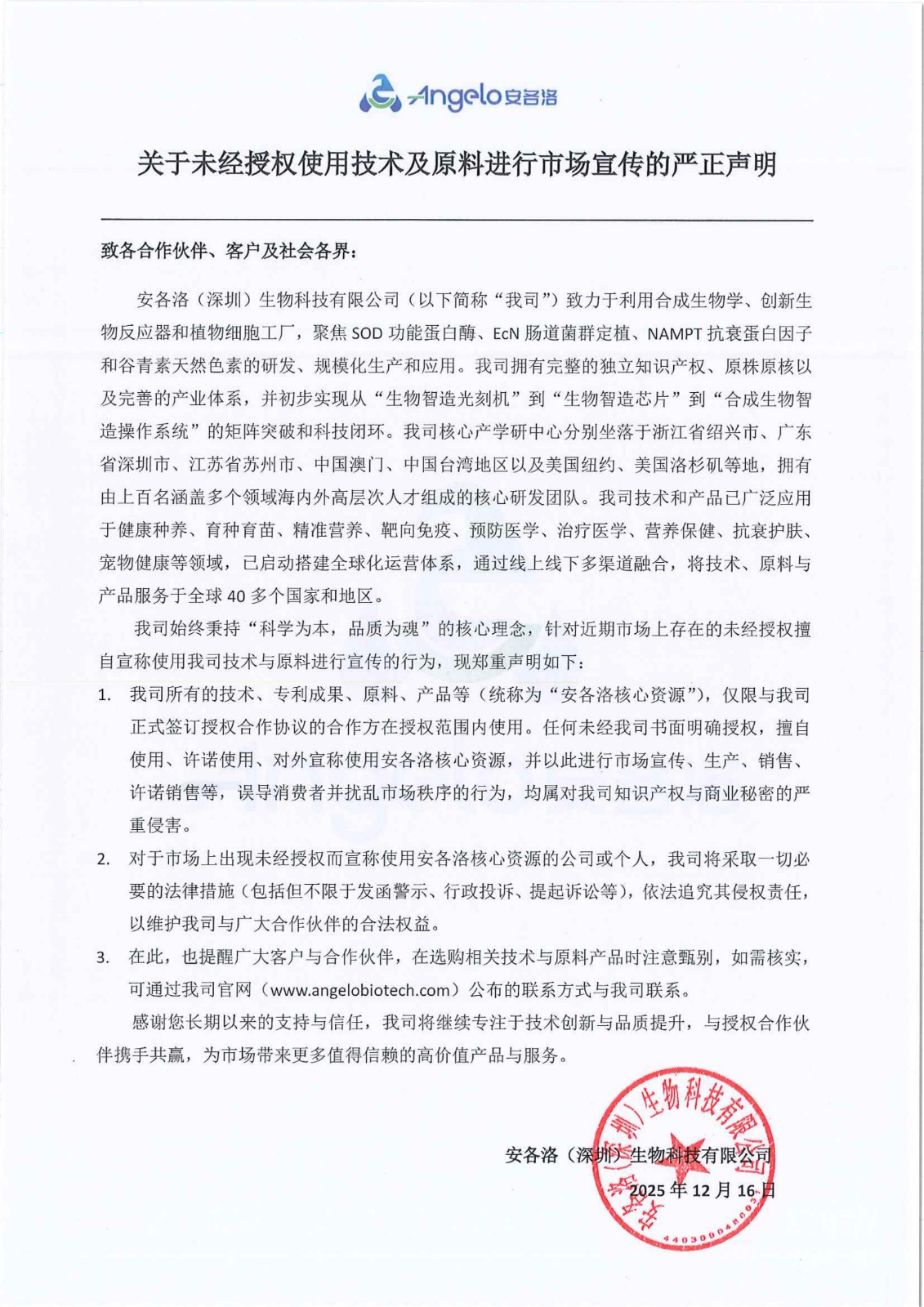 安各洛生物始终秉持“科学为本,品质为魂”的核心理念,针对近期市场上存在的未经授权擅自宣称使用我司技术与原料进行宣传的行为,为维护我司与广大合作伙伴的合法权益,现发布严正声明与法律追责措施。