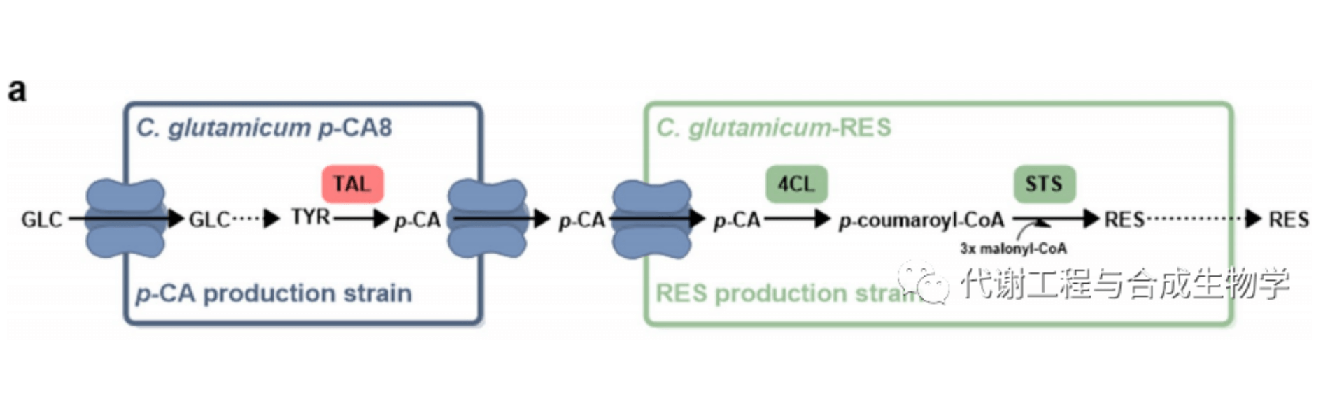 5、最后,该生产菌株p-CA8被用于与一株预先改造的对香豆酸转化为多酚白藜芦醇的谷氨酸棒杆菌共培养。在无任何对香豆酸的添加的情况下,二者的共培养可以利用葡萄糖合成31.2 mg/L (0.14 mM)的白藜芦醇。