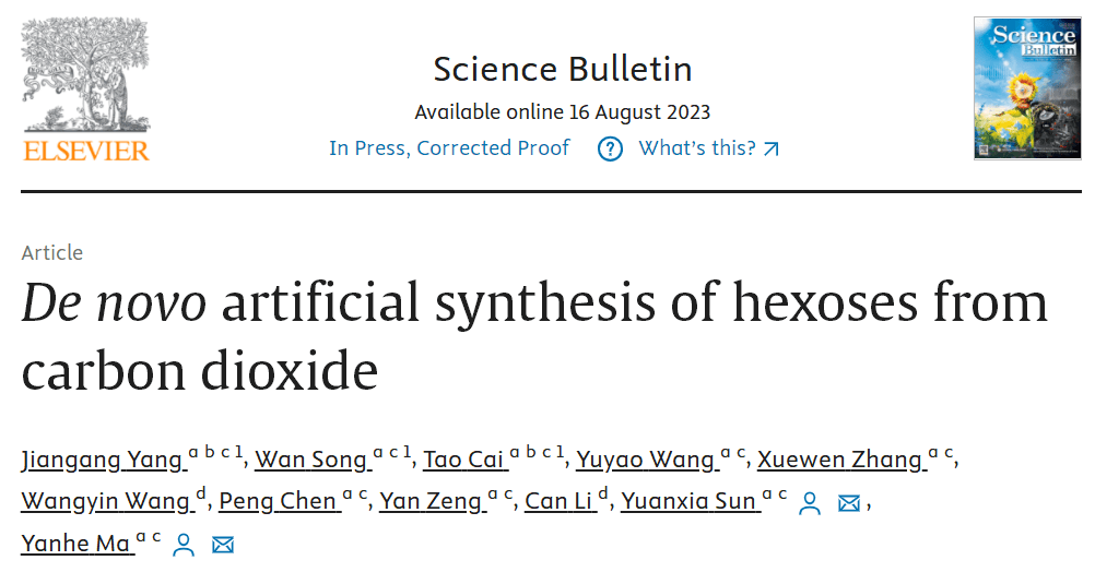 最终,相关论文以《由二氧化碳从头人工合成己糖》(De novo artificial synthesis of hexoses from carbon dioxide)为题发在 Science Bulletin[1],杨建刚是第一作者,天津工业生物所所长马延和以及孙媛霞研究员担任共同通讯作者。