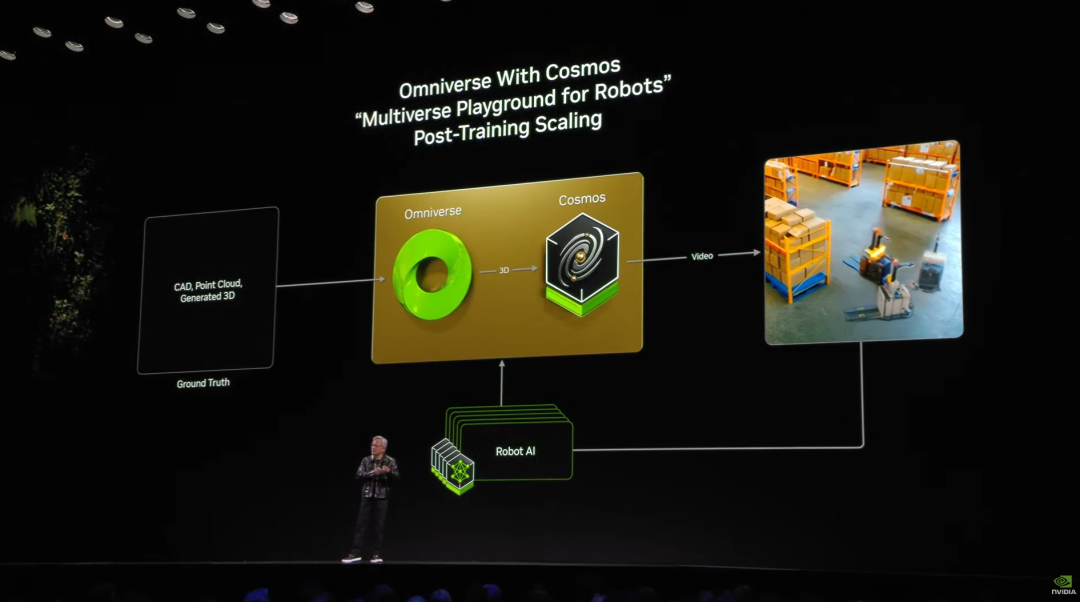 同样,Isaac GR00T 蓝图也可以与 Cosmos 和 Omniverse 无缝集成,形成一个完整的机器人开发生态系统。