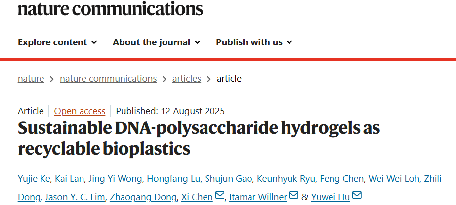 1.Ke, Y., Lan, K., Wong, J.Y. et al. Sustainable DNA-polysaccharide hydrogels as recyclable bioplastics. Nat Commun 16, 7467 (2025). https://doi.org/10.1038/s41467-025-62682-1