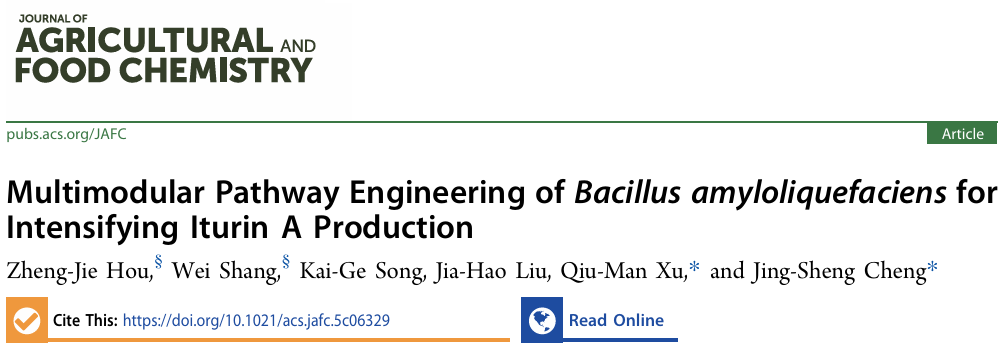 1.Hou ZJ, Shang W, Song KG, Liu JH, Xu QM, Cheng JS. Multimodular Pathway Engineering of Bacillus amyloliquefaciens for Intensifying Iturin A Production. J Agric Food Chem. Published online September 16, 2025. doi:10.1021/acs.jafc.5c06329