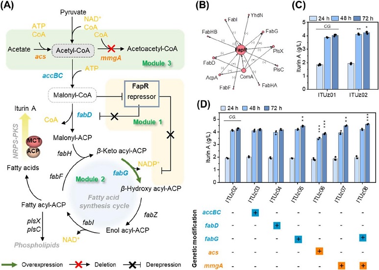 为突破生产瓶颈,研究团队提出了系统性的多模块途径工程思路,将细胞代谢拆分为若干核心模块,并通过精确的基因工程手段逐一优化。在脂肪酸合成模块中,团队敲除了转录抑制因子 fapR 以解除抑制效应,过表达了关键基因 fabG 以加速脂肪酸延伸,并通过删除 mmgA 调整乙酰辅酶 A 的代谢流向,使其更倾向于脂肪酸合成。经过这一系列操作,工程菌株的脂肪酸合成能力得到强化,为 Iturin A 的合成提供了更充足的“骨架”供应。