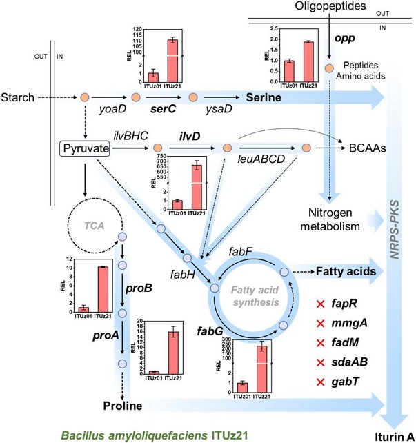 支链氨基酸代谢则是另一个关键切入点。研究团队通过过表达 ilvD 提升支链氨基酸的合成通量,同时发现敲除 gabT 可减少其下游消耗,从而将更多的支链氨基酸流向 Iturin A 合成通路。改造结果显示,支链氨基酸的代谢流向得到优化,Iturin A 产量在此基础上进一步提高。在此过程中,团队通过转录水平分析证实,关键基因的上调表达为前体供应提供了有力保障。