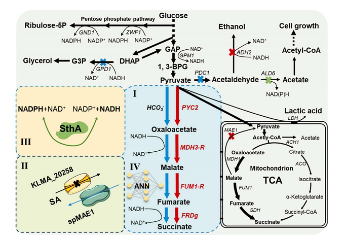 在此基础上,研究人员进一步重构了还原型三羧酸循环(rTCA)通路,这是合成琥珀酸的一条高理论得率路径。通过调整关键酶的位置和基因剂量,他们减少了中间代谢物的堆积,并额外引入来自大肠杆菌的可溶性跨氢酶(SthA),帮助调节 NADH/NAD⁺ 平衡,确保还原力充足供应琥珀酸合成。经过这一系列代谢工程改造,改造菌株在摇瓶水平的 SA 产量已明显提升。