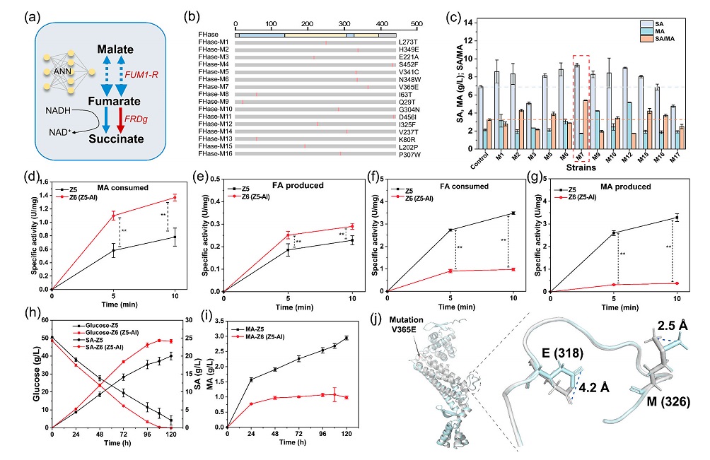 实验结果显示,这一单点突变能够明显增强苹果酸向富马酸转化的效率,同时显著抑制逆反应,使琥珀酸合成效率提高了 30% 以上,而副产物苹果酸减少了近 70%。